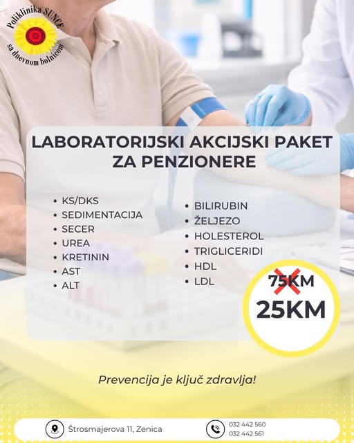 U laboratorijskoj dijagnostici poliklinike Sunce sa dnevnom bolnicom Zenica se provode biohemijske, hematološke, imunohemijske i mikrobiološke pretrage.