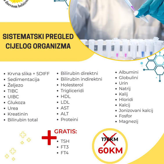 Laboratorijska dijagnostika; - Ortopedski pregledi; - Hirurški pregledi; - Pedijatrijski pregledi; - Otorinolaringološki pregledi; - Ginekološki pregledi; - Internistički pregledi; - Neurološki pregledi; - Kardiološki pregledi; - Kompletna Ultrazvučna dijagnostika; - Magnetna Rezonanca; - CT i Rentgen dijagnostika; - Mamografija i Dexa ili Denzitometrija kostiju.