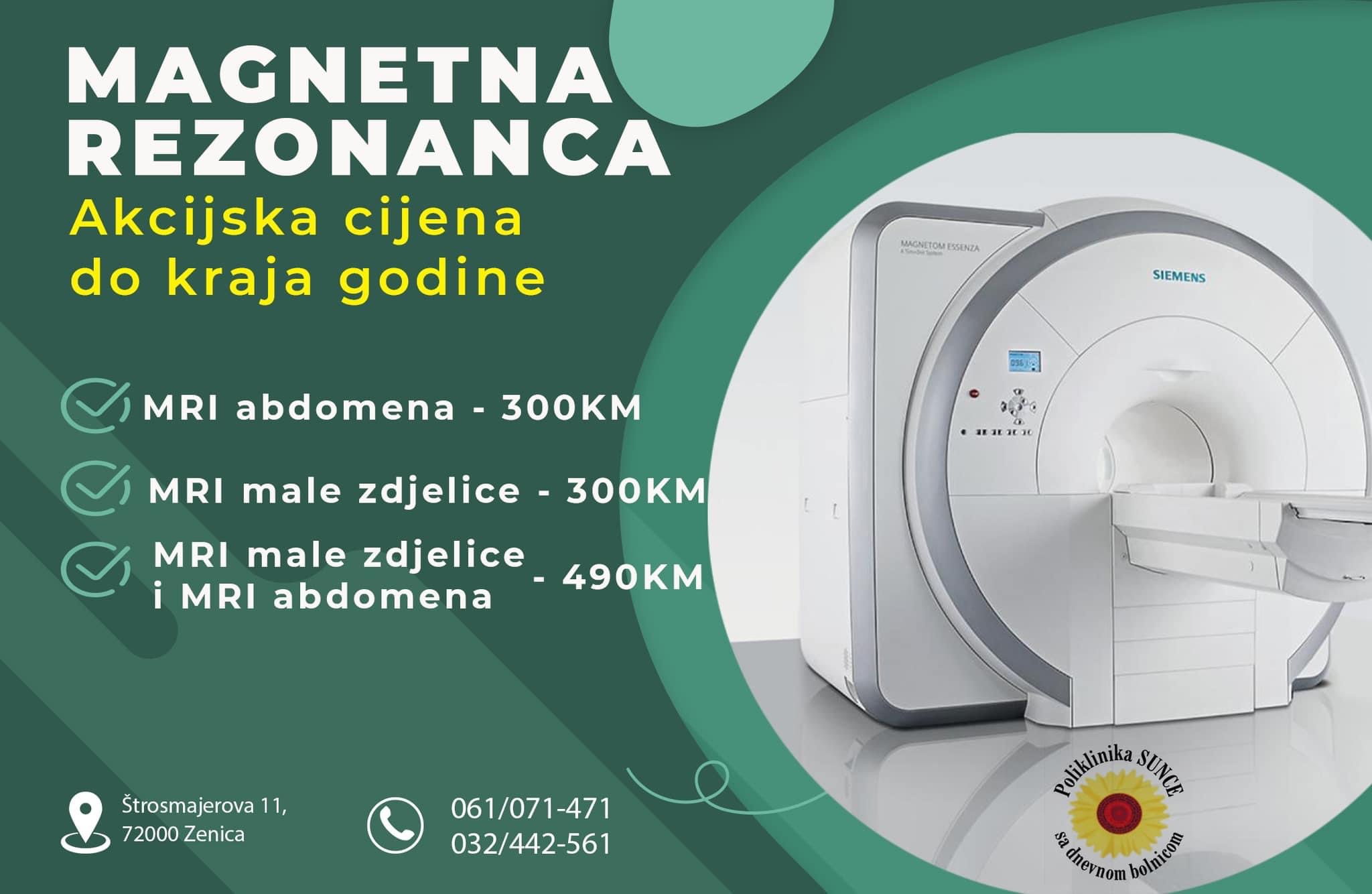Magnetska rezonanca u Polillinici „ S U N C E „ pripada novijoj generaciji MRI uređaja sa jakim magnetnim poljem od 1,5 Tesla i opremljen je sa novim tehnološkim riješenjima u cilju poboljšanja kvalitete slike i efikasne dijagnoze.
