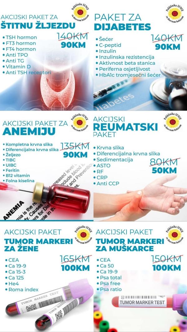 Laboratorijska dijagnostika; - Ortopedski pregledi; - Hirurški pregledi; - Pedijatrijski pregledi; - Otorinolaringološki pregledi; - Ginekološki pregledi; - Internistički pregledi; - Neurološki pregledi; - Kardiološki pregledi; - Kompletna Ultrazvučna dijagnostika; - Magnetna Rezonanca; - CT i Rentgen dijagnostika; - Mamografija i Dexa ili Denzitometrija kostiju.