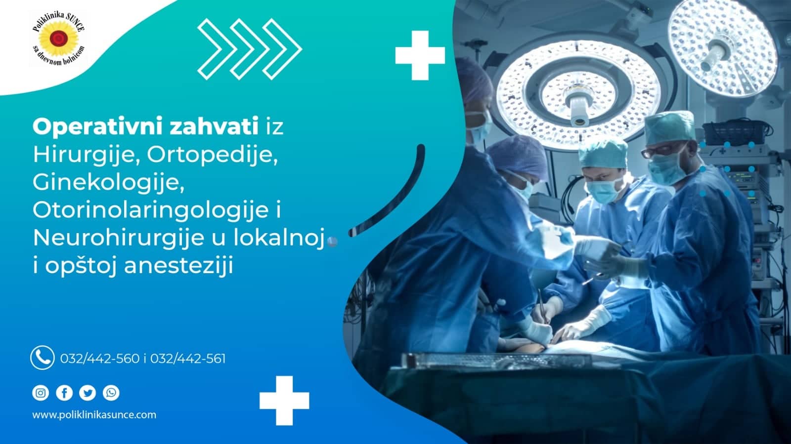 U četiri savremeno opremljene operacione sale izvode se klasični I endoskopski operativni zahvati iz oblasti Opšte Hirurgije, Neurohirurgije, Ortopedije u lokalnoj i opštoj anesteziji.