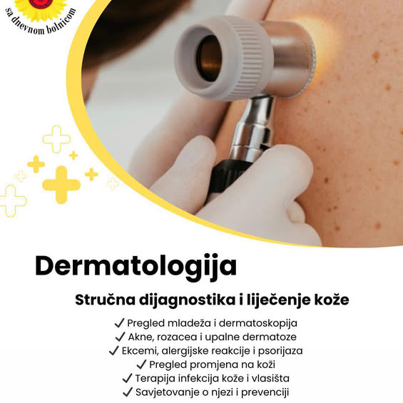 U Poliklinici Sunce sa dnevnom bolnicom Zenica pružamo kompletnu dermatološku dijagnostiku i tretman kožnih, vlasišnih i nokatnih oboljenja. Naši dermatolozi pristupaju svakom pacijentu individualno, uz primjenu savremenih dijagnostičkih metoda i terapijskih protokola.