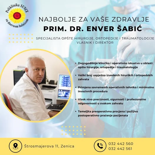 Prim. dr. Enver Šabić, specijalista opšte hirurgije te specijalista ortopedije i traumatologije, osnivač je i direktor Poliklinike SUNCE sa dnevnom bolnicom Zenica.